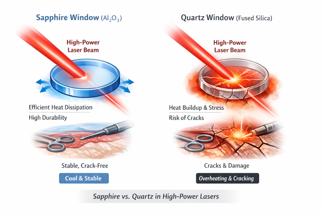 Consequently, sapphire windows are now standard in femtosecond eye surgery, high-power Nd:YAG lasers for tumor ablation, and various precision surgical laser systems, while quartz is generally limited to low-power or non-critical window applications.